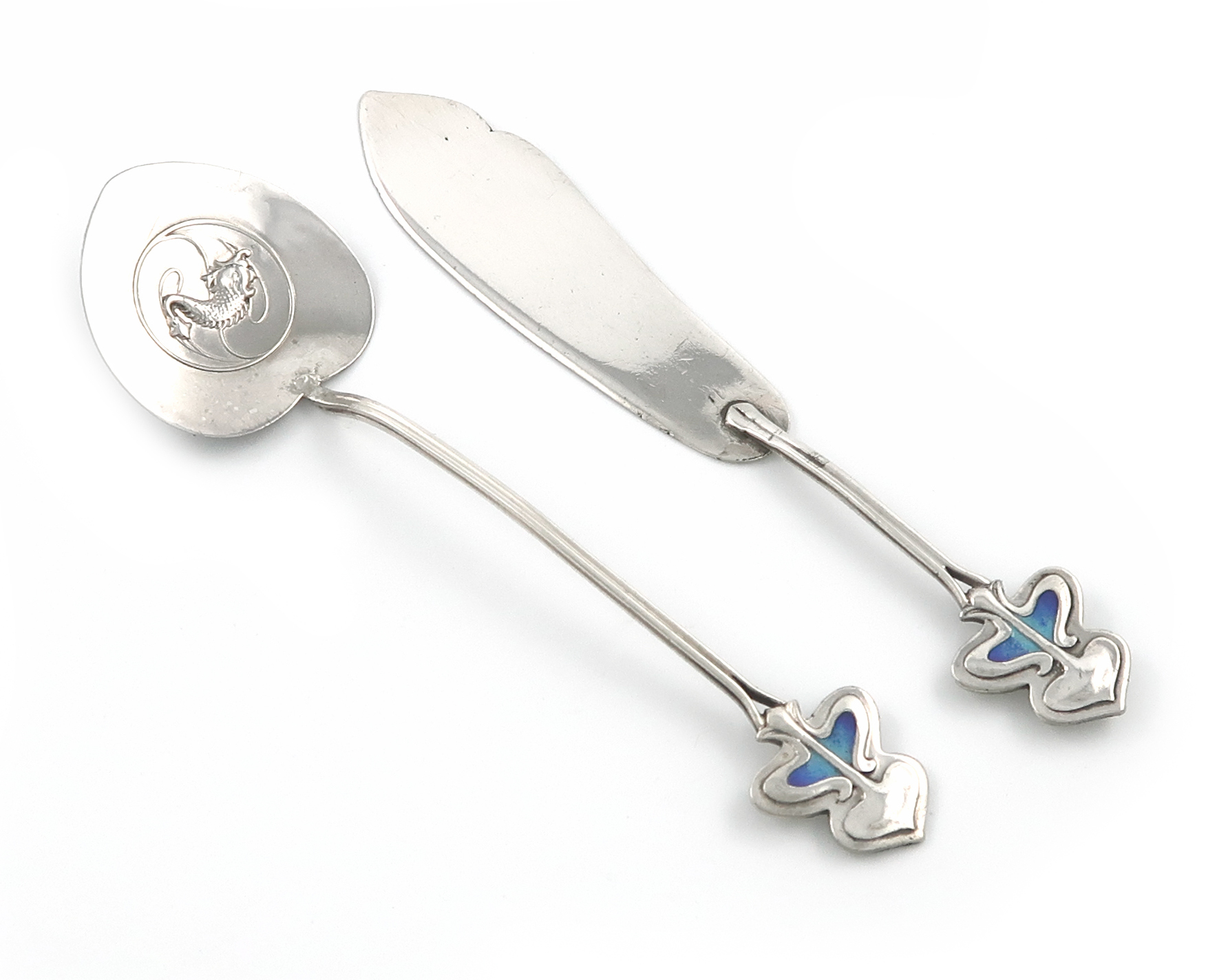 By R W Hewett & Co., An Edwardian Art Nouveau silver and enamel butter knife and jam spoon,