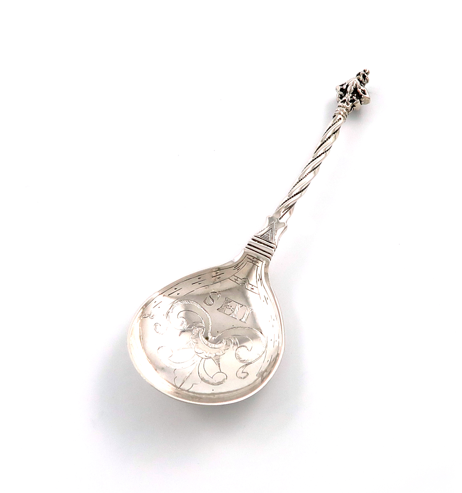 the fig-shaped bowl with engraved decoration and inscribed 'IHS', tapering spiral stem, with a cherub head final, length 15.8cm, approx. weight 1.3oz.