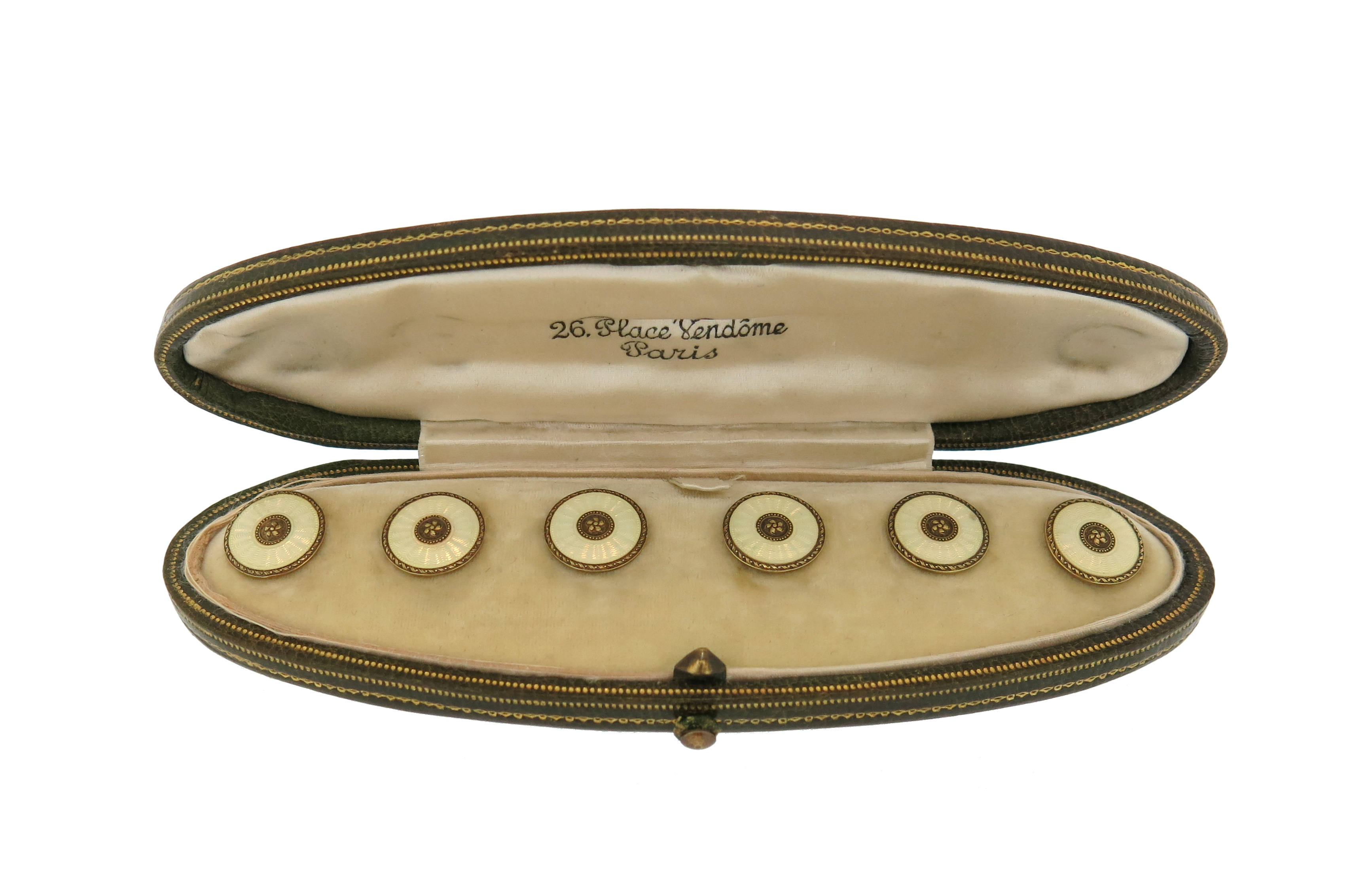 A set of six late 19th century French enamel gold buttons, each circular gold button with a foliate motif to the centre and with oyster guilloche enamel decoration, all with French control mark and maker's mark G*D for Germain Desbazeille, each 1.4cm high, fitted case by Boucheron