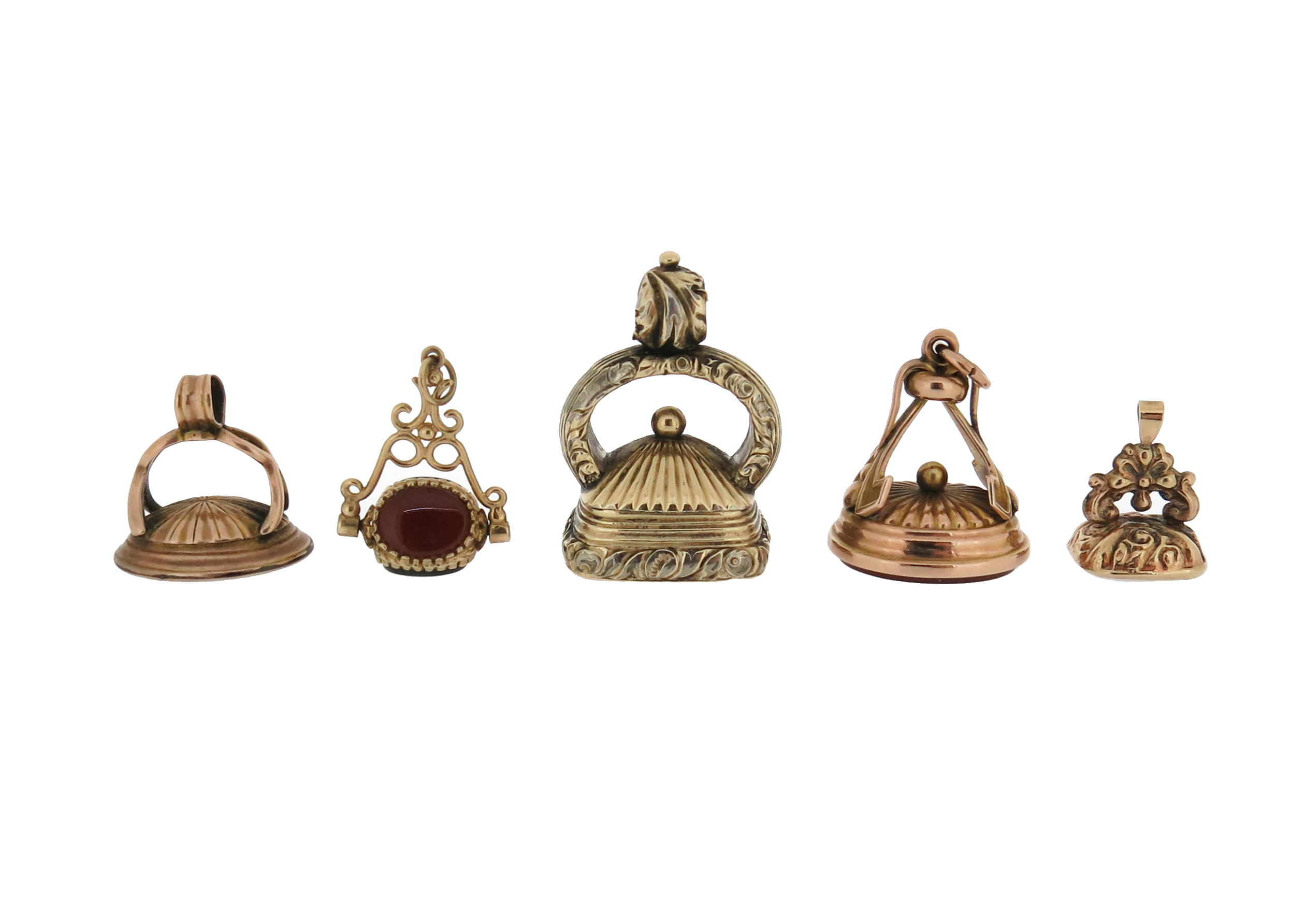 Five gold and gold-cased fob seals, set with various plain and engraved hardstones