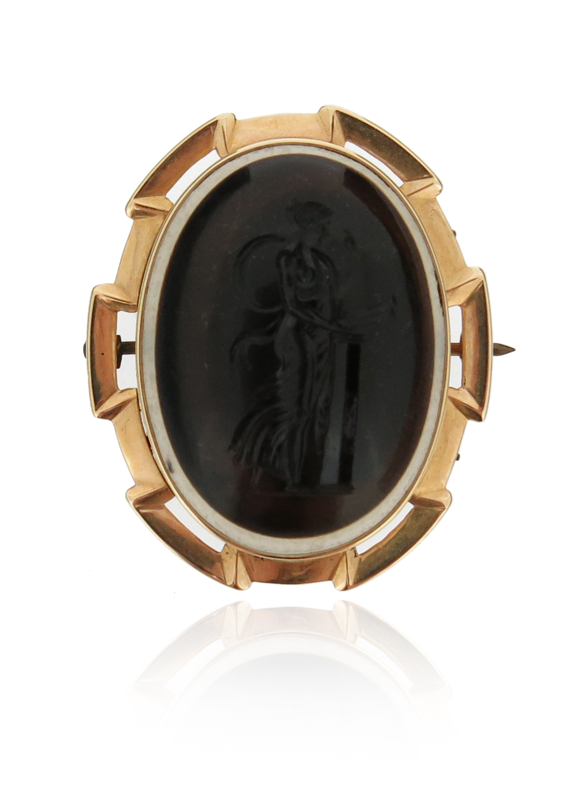A 19th century banded agate intaglio brooch, depicting Cassandra in profile within yellow gold surround, 3.5cm wide
