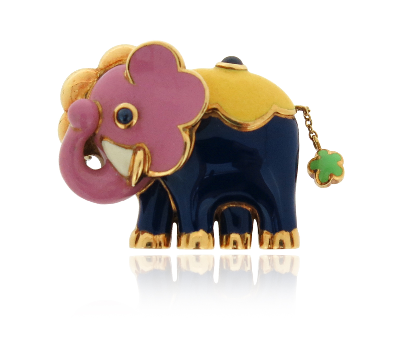 A gold and enamel elephant brooch, decorated with polychrome enamel and cabochon sapphires in yellow gold, with an articulated tail, signed Bioielmoda with Italian marks, 4cm wide