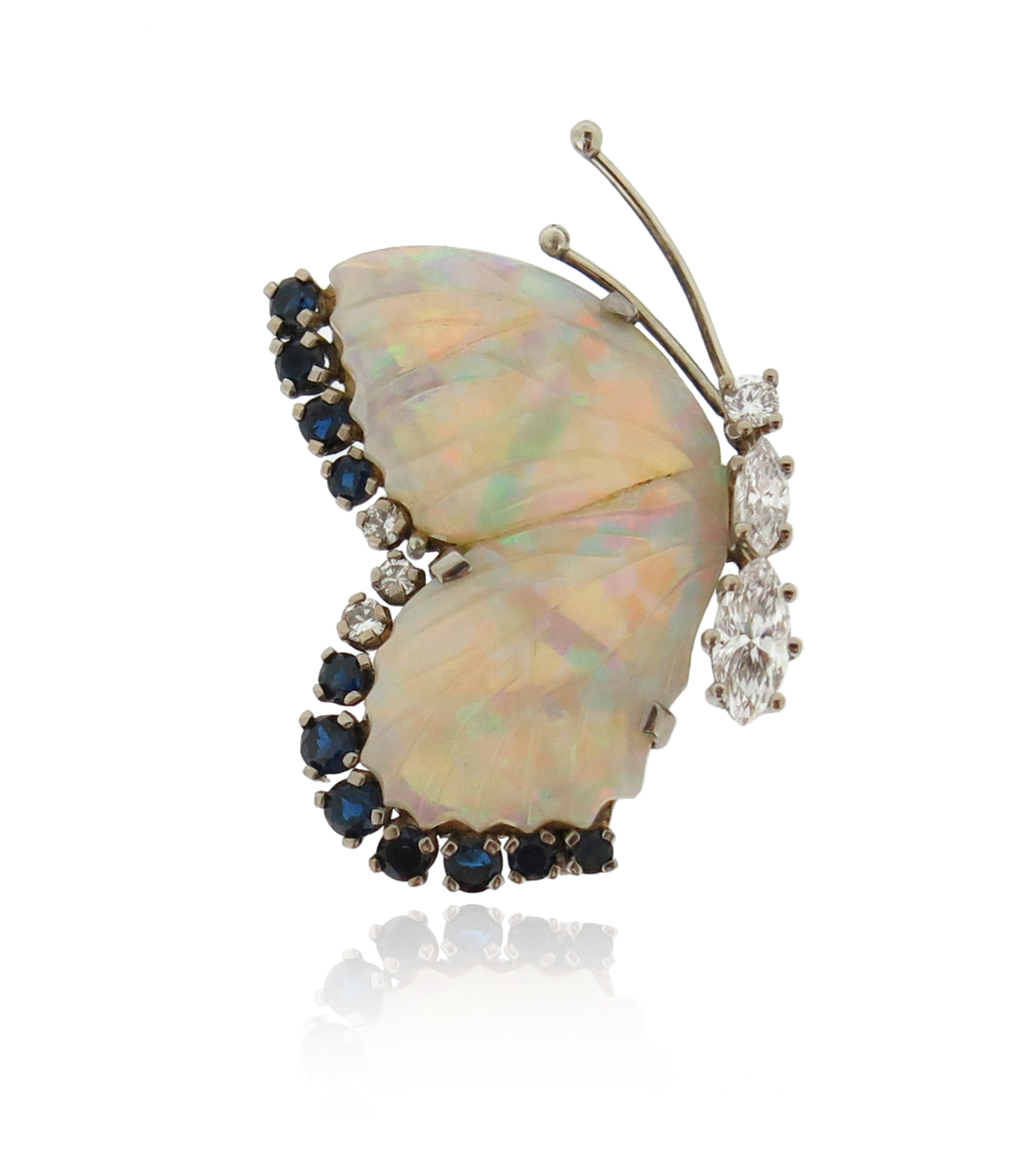 A gem-set gold butterfly brooch, the wings formed from carved white opal with sapphire and diamond tips, the body set with diamonds in white gold, 3cm high