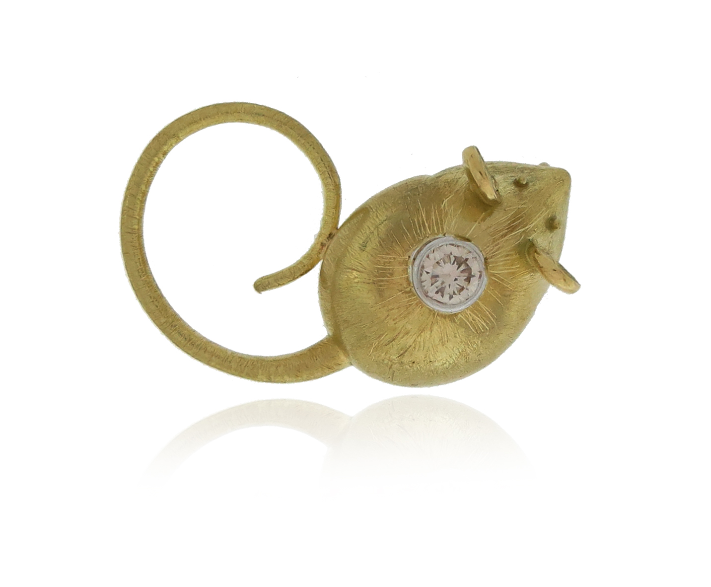 A diamond-set gold mouse brooch by Leo de Vroomen, rubover-set with a round brilliant-cut diamond within textured yellow gold, with maker's mark LDV and 18ct London hallmarks for 1982, 3.2cm wide