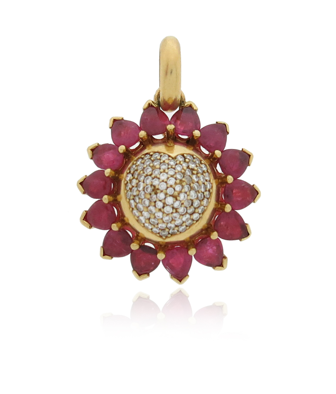 A ruby and diamond sunflower pendant, with a diamond-set heart-shaped centre and cabochon ruby petals in yellow gold, 3.2cm high