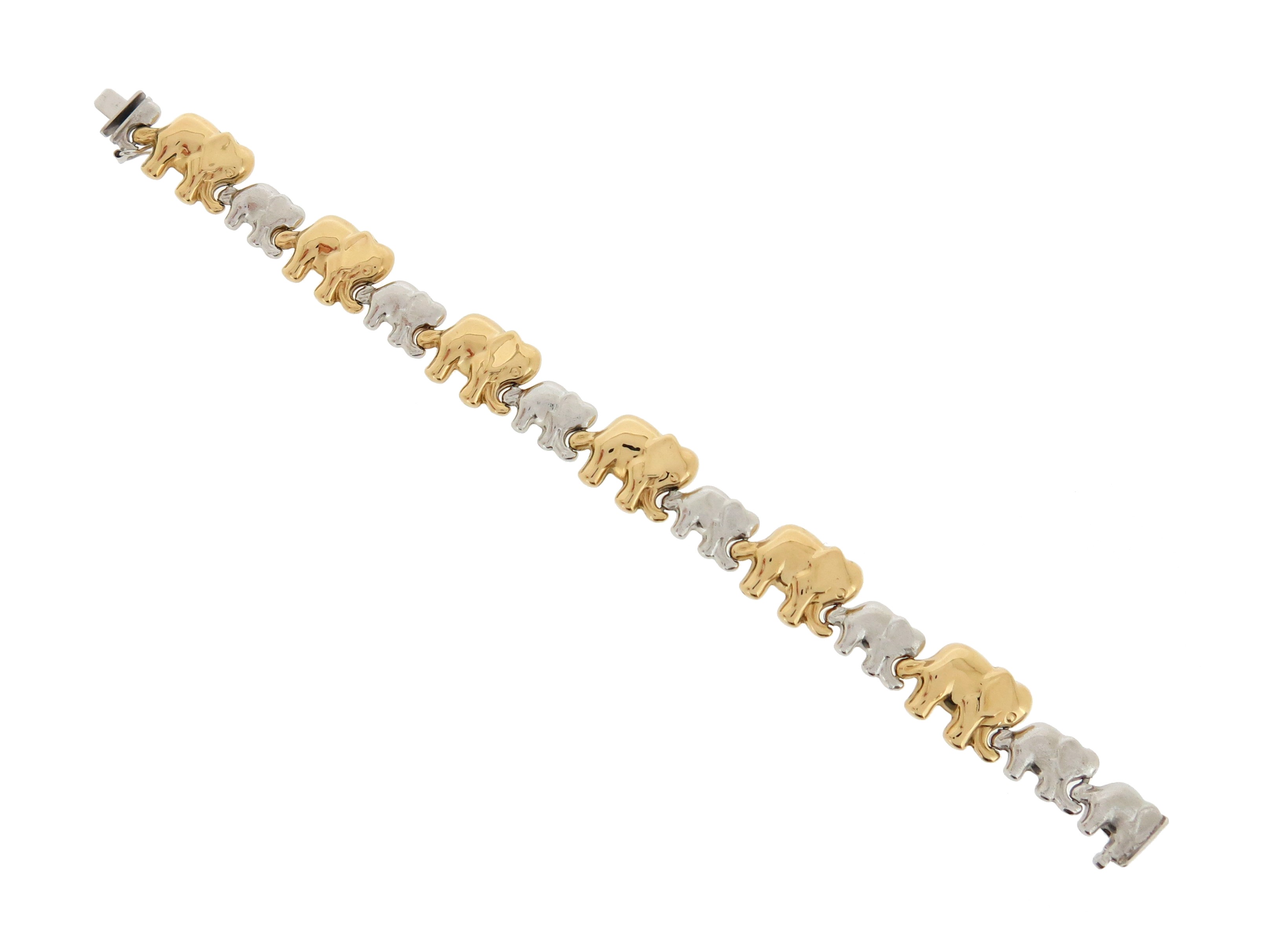 A two colour gold elephant bracelet, set with smaller textured white gold elephants and larger polished yellow gold elephants, 18cm long, 17g