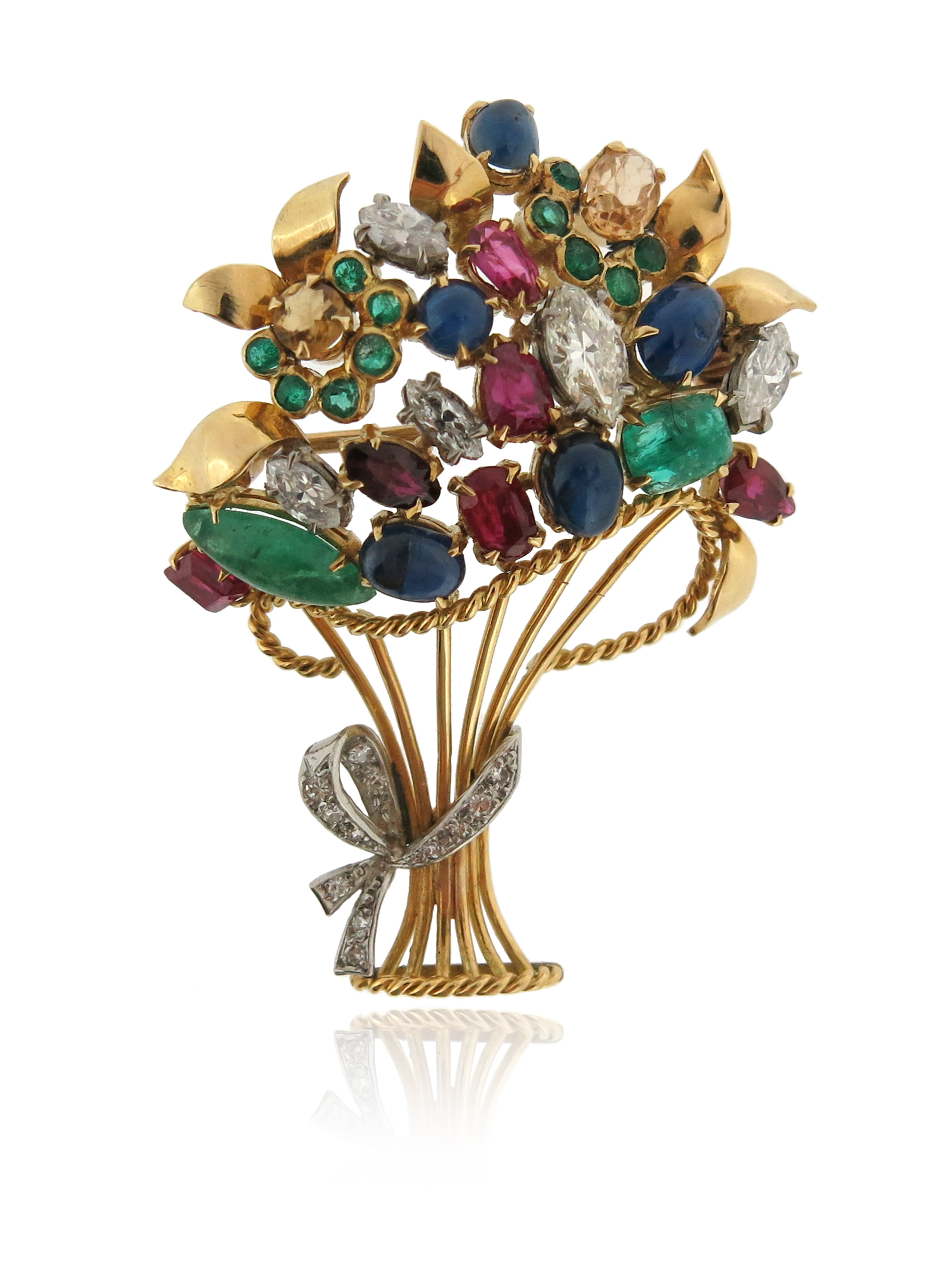 A gem-set giardinetto brooch, set with emeralds, rubies, sapphires and marquise-shaped diamonds in gold, 4.8cm high
