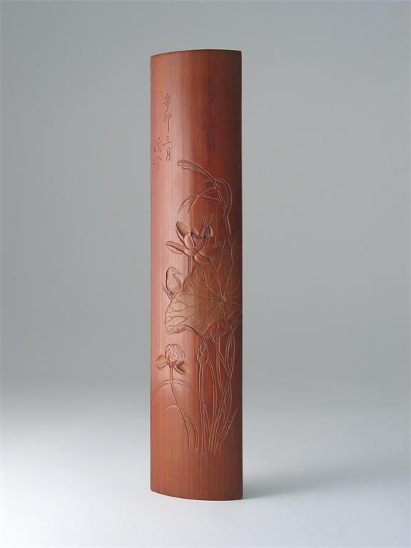 A Chinese bamboo wrist rest, finely carved with a bird and a dragonfly amidst flowering lotus, beneath calligraphy, 18th/19th century, 25.5cm.