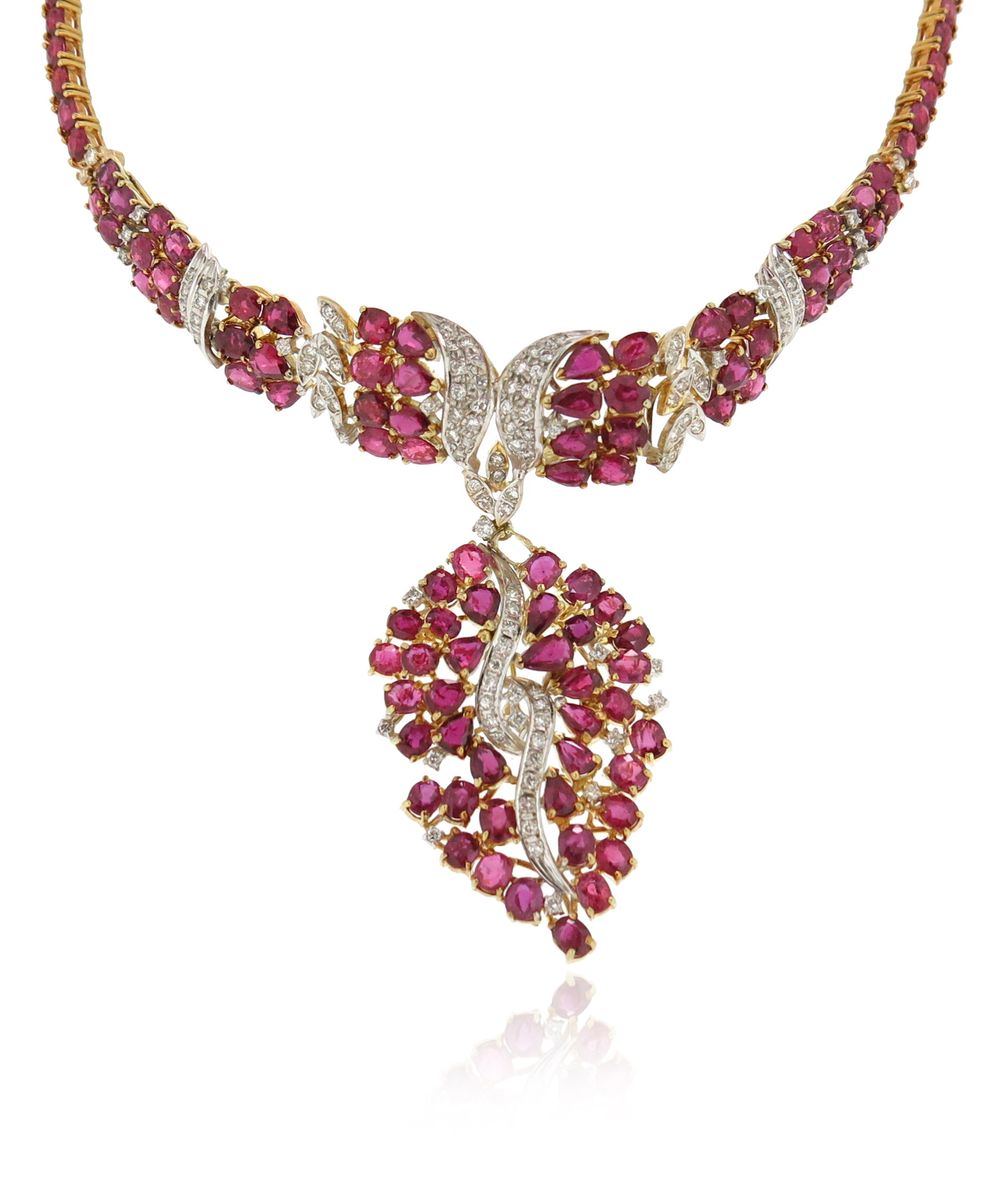 A ruby and diamond-set gold necklace, alternately-set with rubies and diamonds, suspending a leaf-shaped articulated pendant set overall with pear-shaped rubies and a zig zag of graduated circular-cut diamonds in platinum and gold, with a fancy-link yellow gold back chain, 44cm long