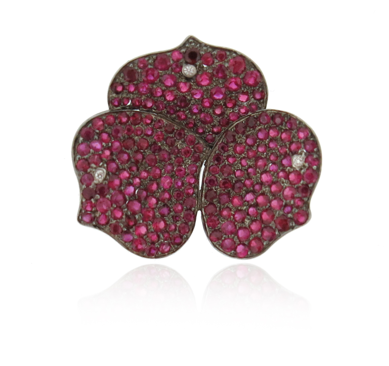 A ruby and diamond flower head pendant, pave-set with circular-cut rubies and a diamond to each petal in platinum, London hallmarks for 2012, 3cm wide
