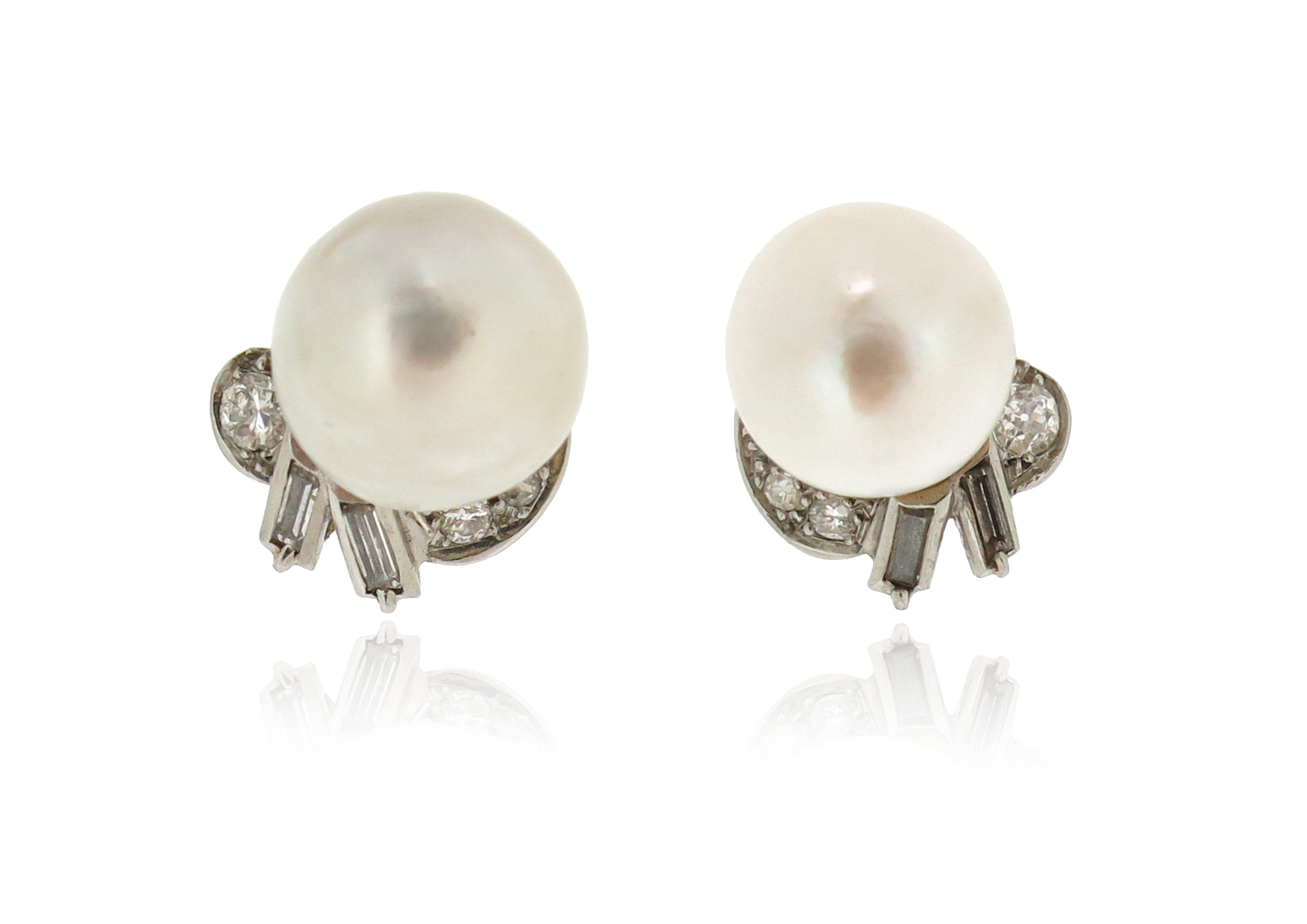 A pair of cultured pearl cluster earrings, the pearls measure approximately 12.1 - 12.3mm, set within a half cluster of baguette-shaped and circular-cut diamonds in platinum and white gold, French import marks, 16mm high
