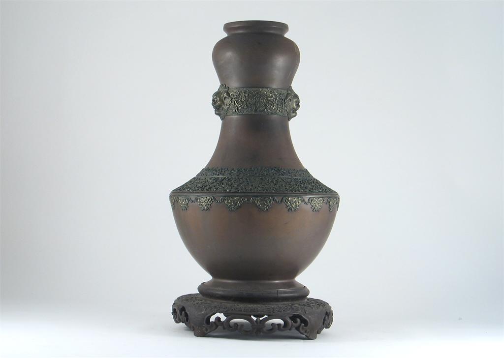 An unusual Chinese lacquer vase, simulating bronze, the body decorated with bands of stylized foliage and raised on an elaborate base. Some wear. 18th/19th century, 49cm.