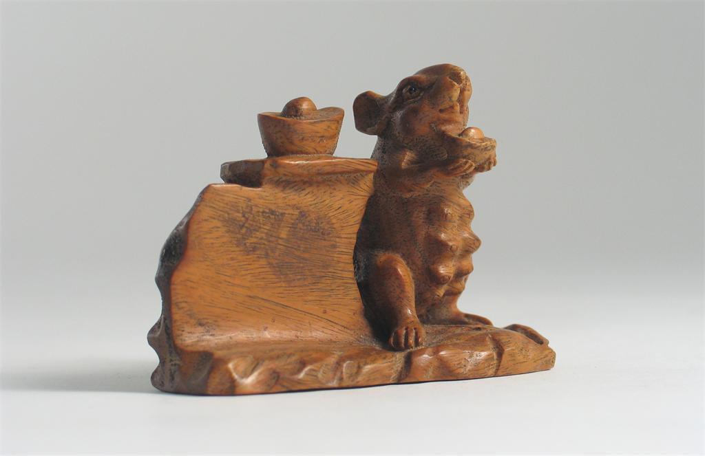 A small wood carving of a rat, holding half a nut, c.1900, 6.5cm.