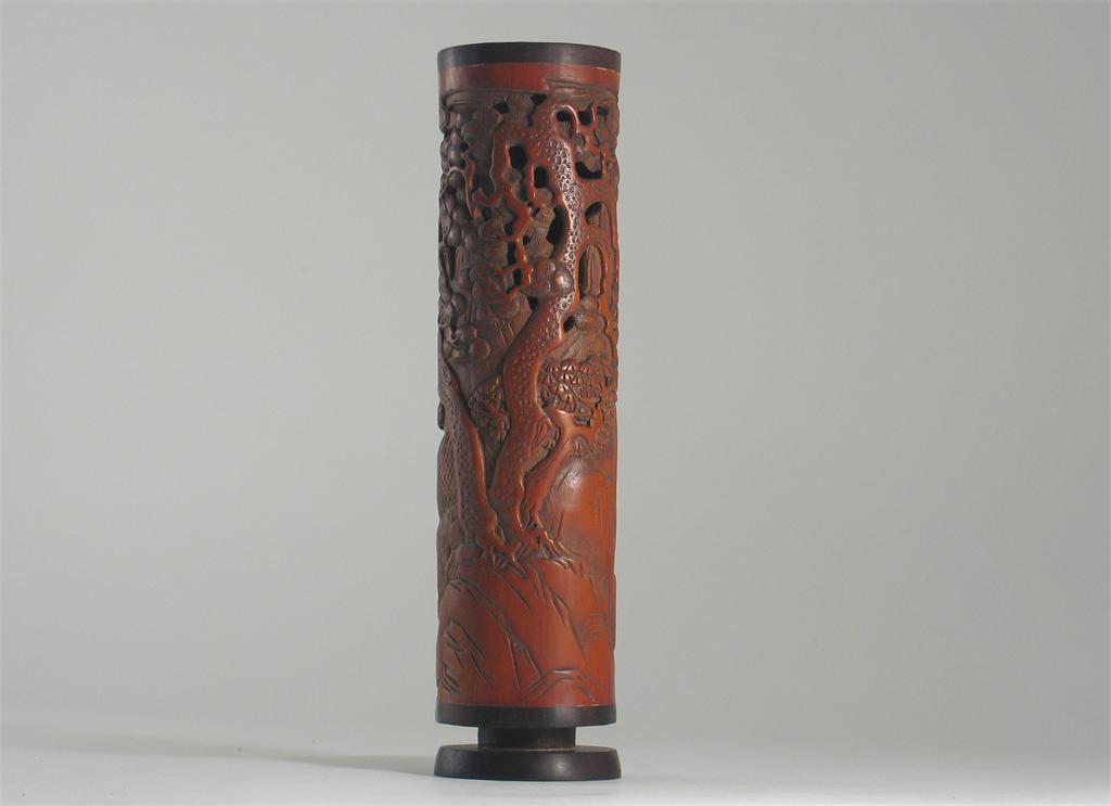A Chinese bamboo perfumier, with a hardwood top and stand, carved with figures in boats beneath pine trees, 28cm.
