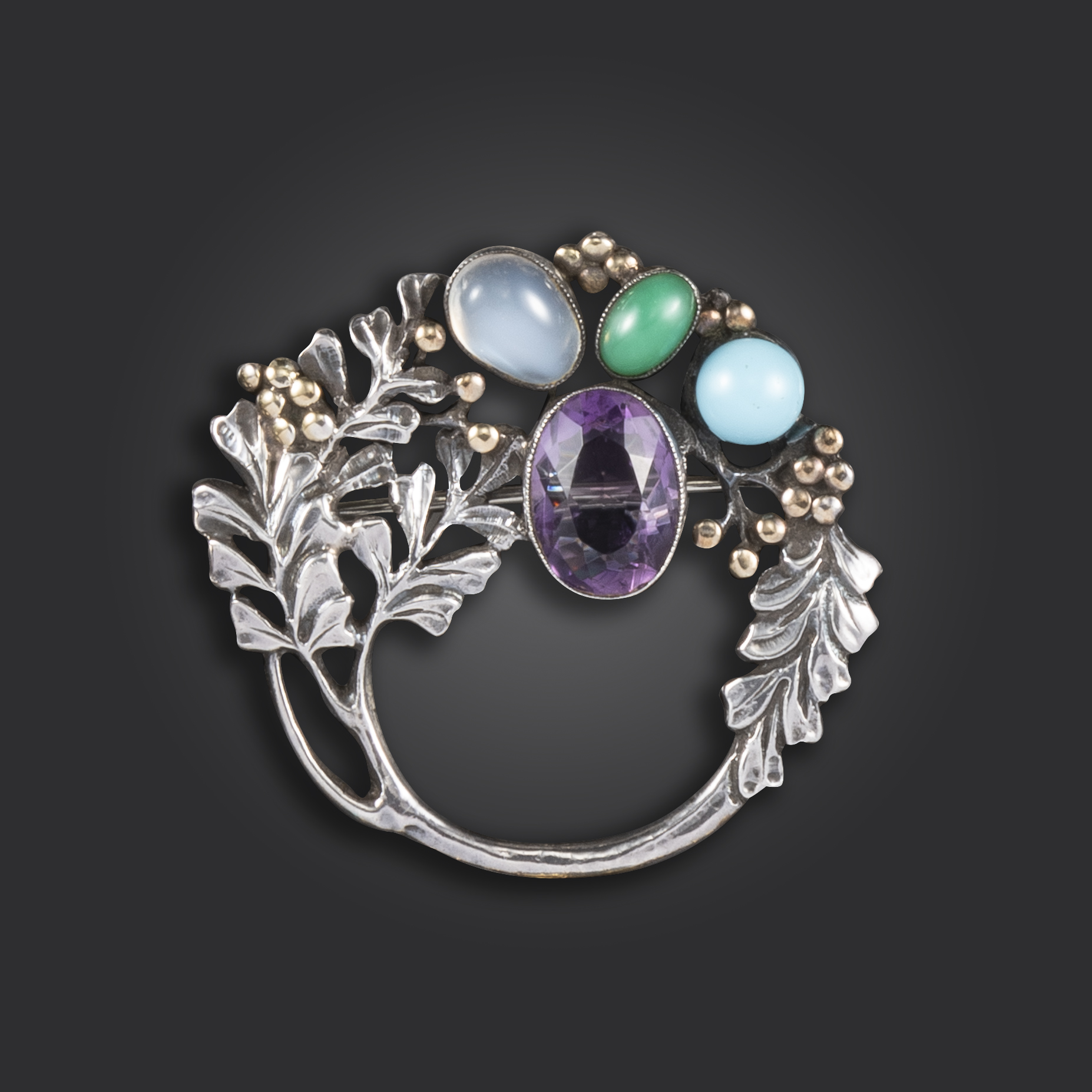 An Arts and Crafts silver and gem-set brooch, of stylised wreath form set with amethyst, moonstone and turquoise in silver, 4.5cm wide