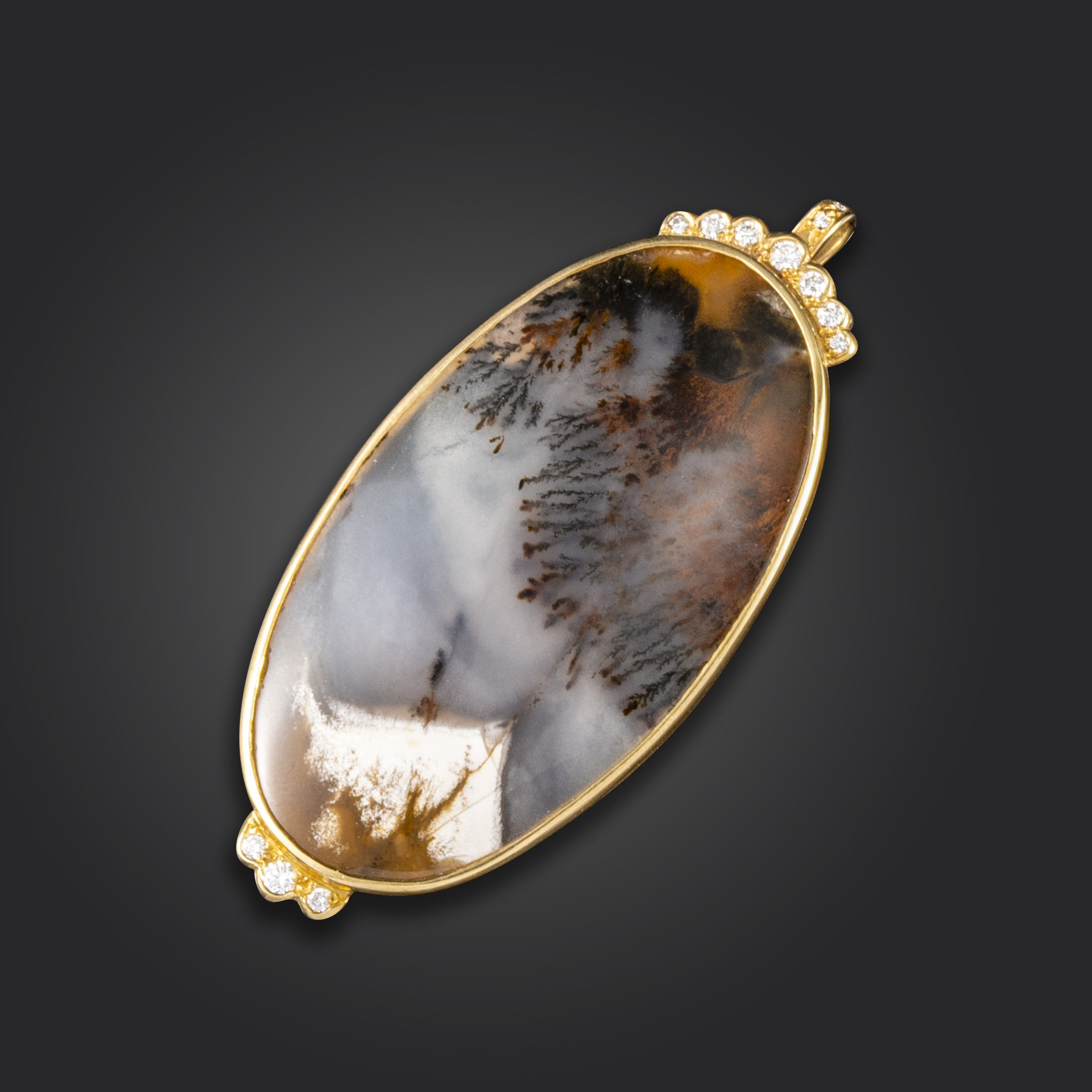 A moss agate mounted gold pendant brooch by Geoffrey Rowlandson, the oval moss agate displays a particularly interesting pattern of inclusions, set in 18ct yellow gold with small diamonds set to each end, marks for London 2003 and maker's mark, 5.5cm high