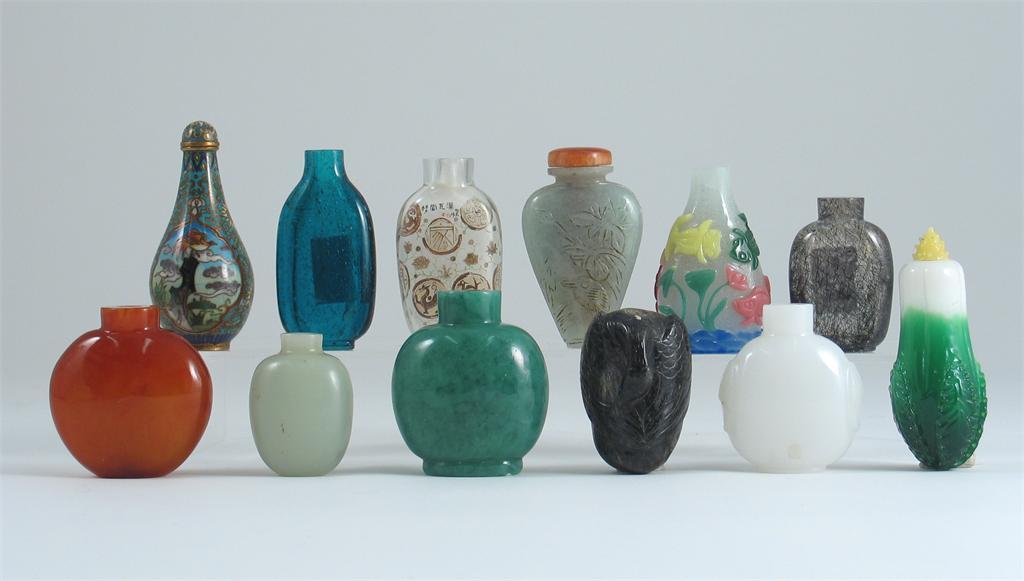 Twelve Chinese snuff bottles, in jade, glass, cloisonn and hardstone. (12)