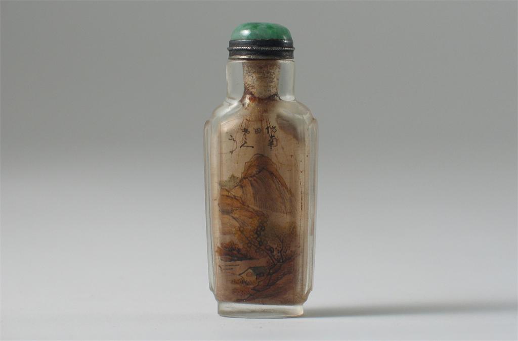 A Chinese interior painted glass snuff bottle, decorated with a mountain landscape and with vases to the reverse, 19th/20th century, 6.2cm.