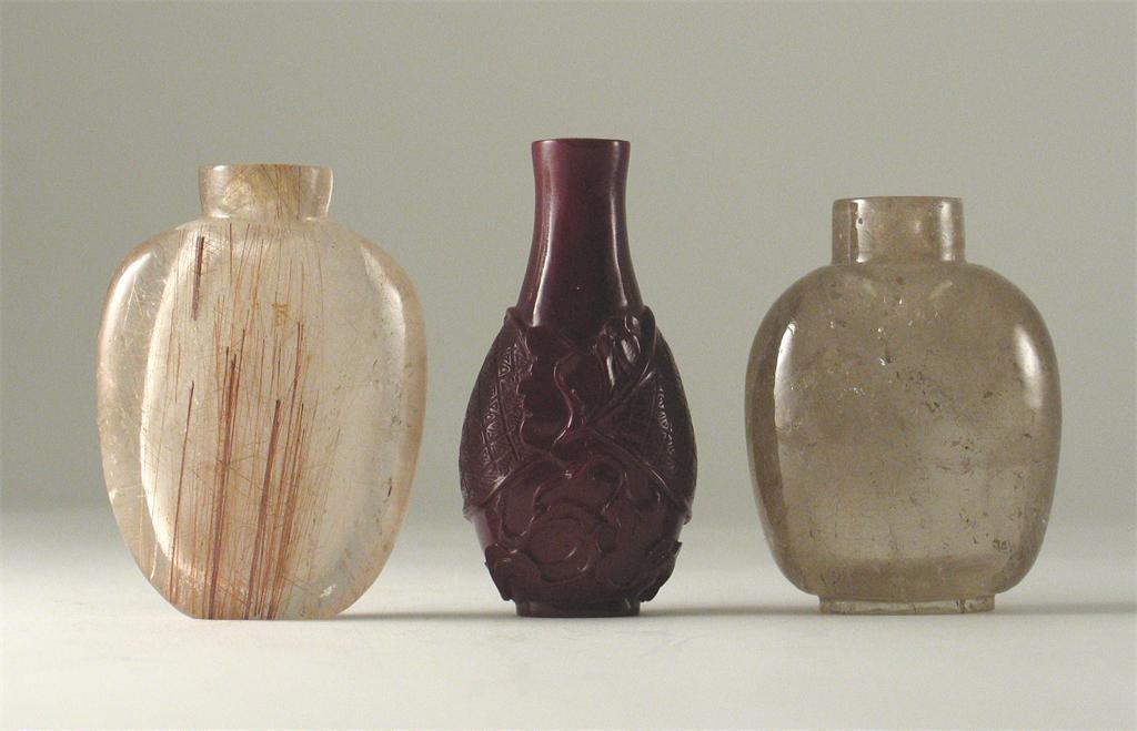 Three snuff bottles, one in aubergine coloured glass, decorated with a tied cloth around the body, the others carved from crystal, 19th century, 7.5cm. (3)