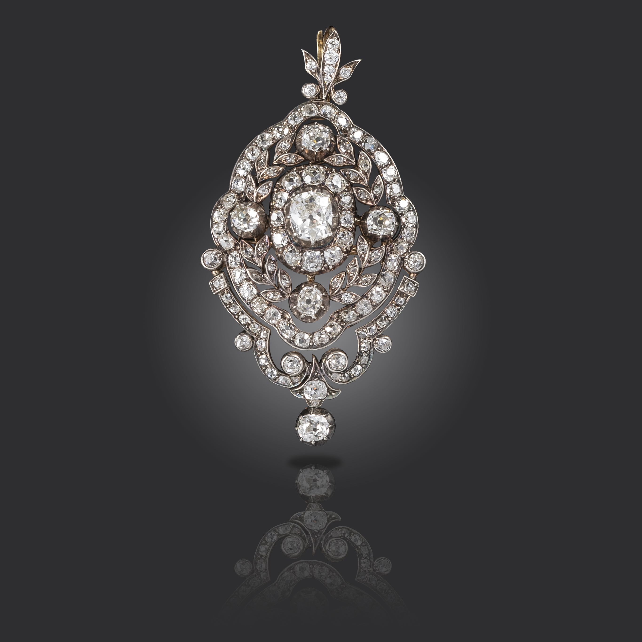 A late Victorian diamond pendant brooch, centred with an old cushion-shaped diamond weighing approximately 1.20cts, in a quatrefoil surround with laurel motif and set with old cushion-shaped diamonds, suspending a hinged lower section with diamond drop, with further diamonds to the fleur-de-lys bale, in silver on gold, detachable brooch fitting, detachable pendant loop, 6.8cm high