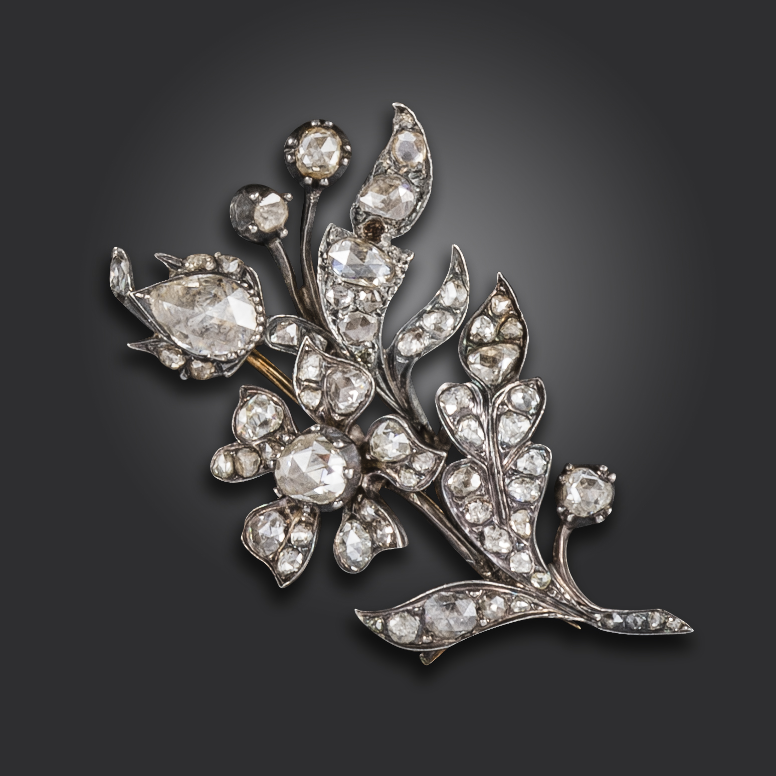 An early 19th century diamond-set foliate brooch, the floral spray set overall with graduated rose-cut diamonds in silver on gold, 5.3cm high
