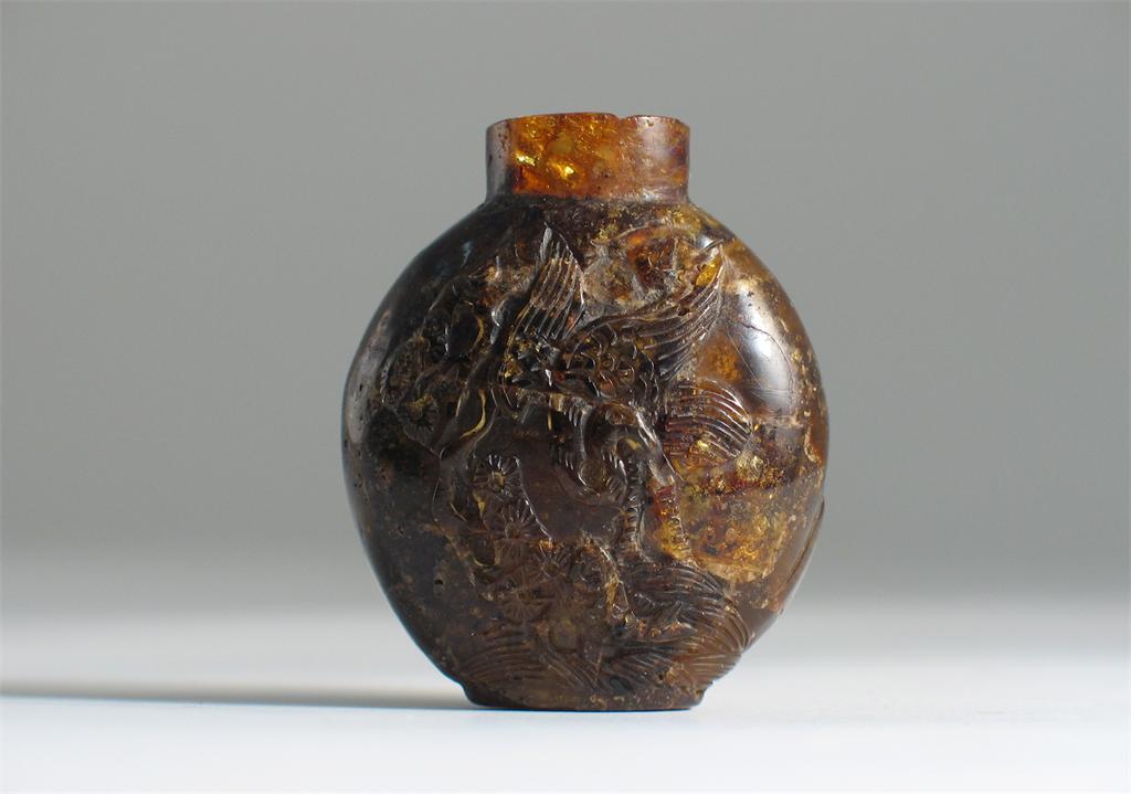 A Chinese reconstituted amber snuff bottle, decorated with cranes above leaping fish, beside pine, 18th/19th century, 5cm.