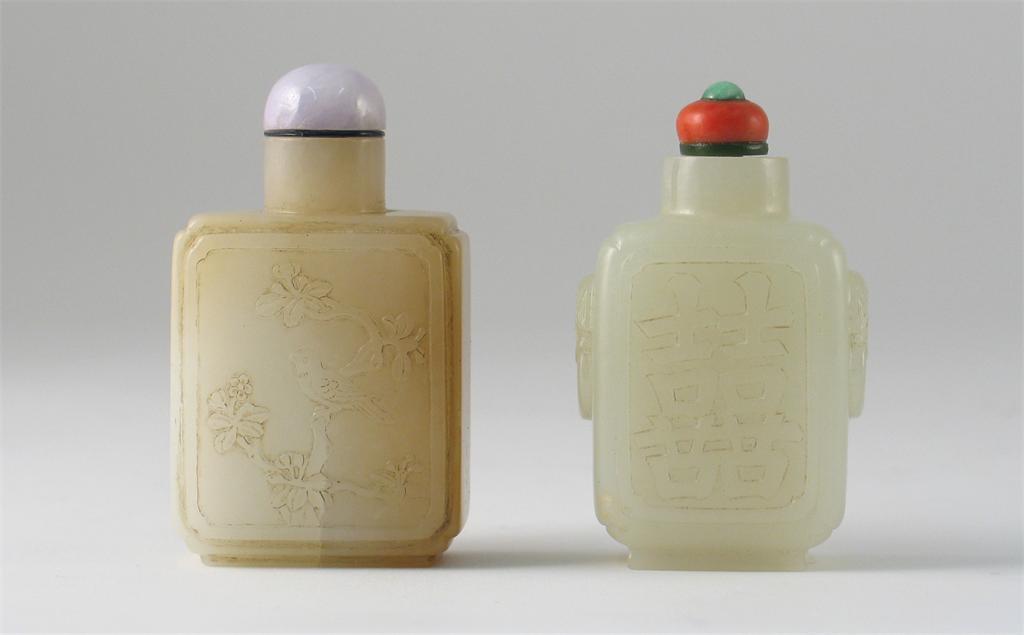 Two Chinese pale celadon jade rectangular snuff bottles, one carved with a bird on a branch, the other with calligraphy, 18th/19th century, 7cm. (2)