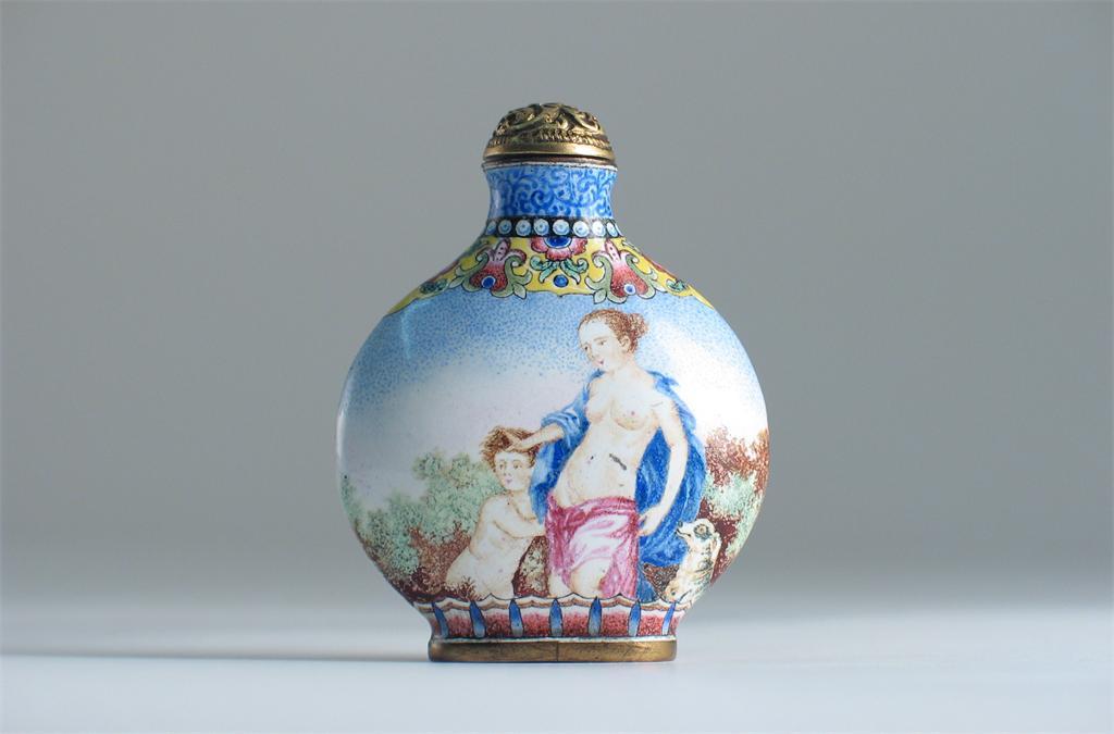 Erotic interest: a Chinese enamel snuff bottle, each face decorated with a maiden attended by a boy, a dog and a lion, the base with a four character Qianlong mark, 6cm.
