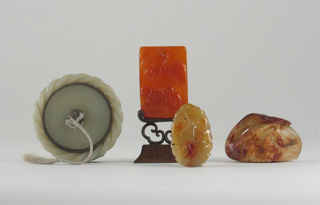 Two Chinese hardstone plaques, one carved with monkeys, the other pomegranate, a jade rondel mounted as a mirror and a jade model of a crane, various dates. (5)