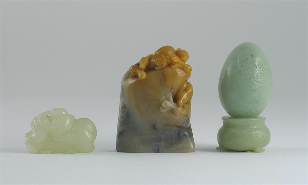Three Chinese nephrite jade carvings, one as an uncut seal of three rabbits eating Chinese lettuce and two further carvings, 19th/20th century, 7cm. Max. (4)