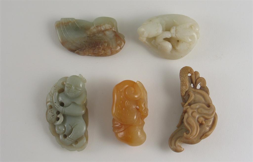 Five Chinese hardstone carvings, three in jade carved as a small boy on a leaf, a mandarin duck and a group of two small feline creatures, and two other carvings, 18th/19th century, 6.5cm. Max. (5)