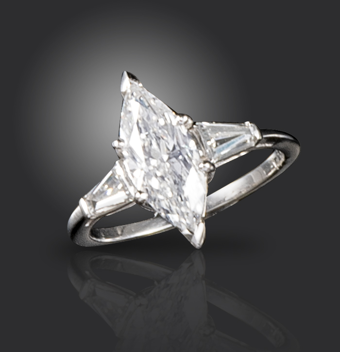 A diamond solitaire ring, the marquise-shaped diamond weighs approximately 1.60cts, set with two tapered baguette shoulder diamonds in platinum, shank stamped 8813, size K