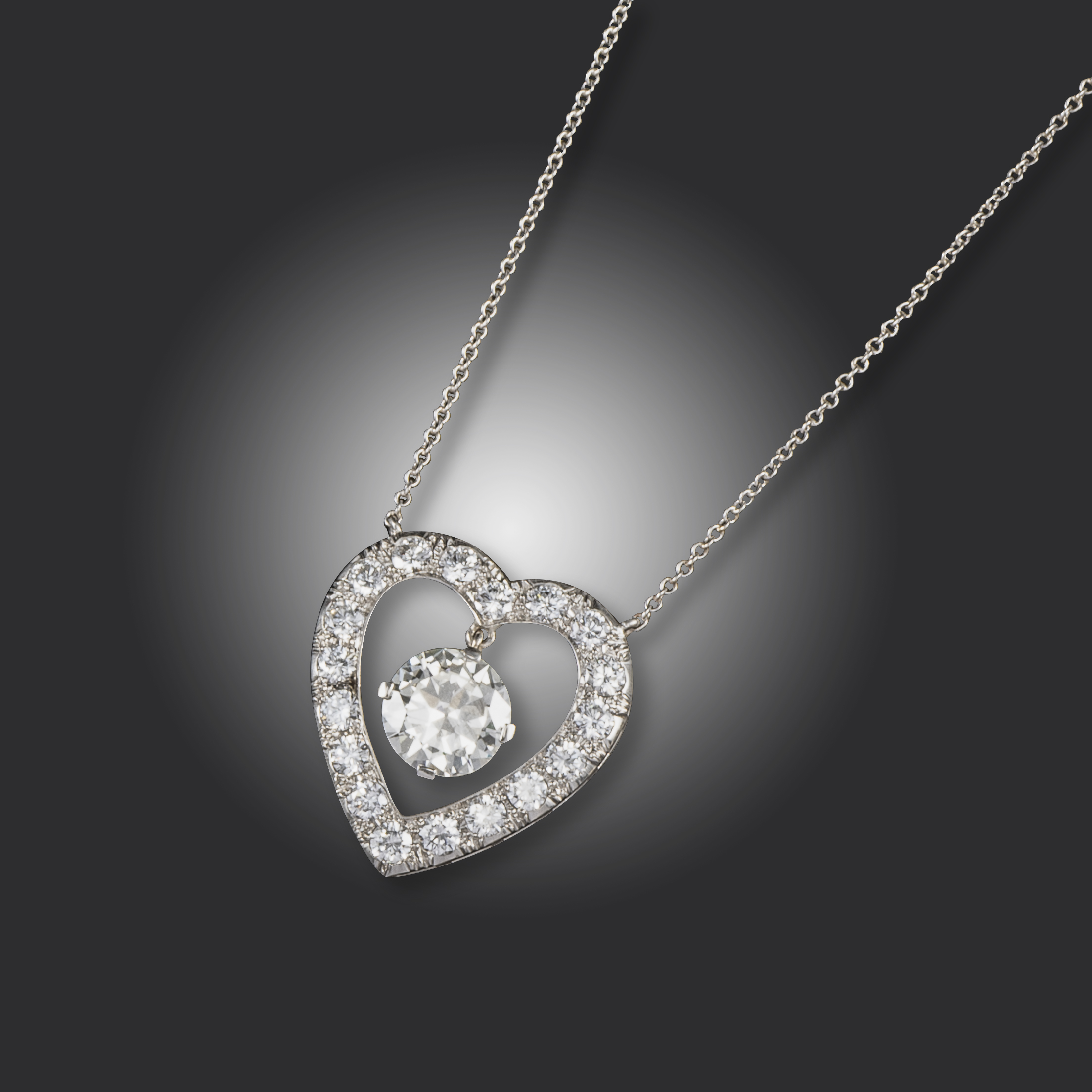 A heart-shaped diamond pendant by J E Caldwell & Co, the heart set with circular-cut diamonds and suspending a larger circular-cut diamond weighing 3.01cts, set in platinum, on fine-link platinum neck chain, signed and numbered W9724, 2.5cm wide, chain 35cm long