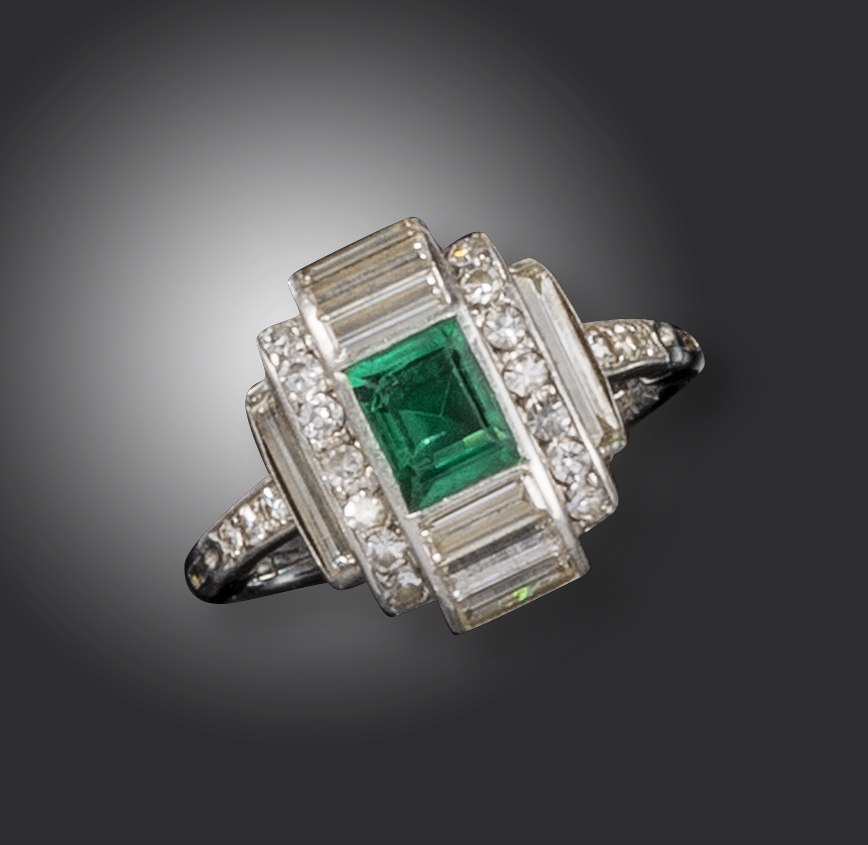 An Art Deco emerald and diamond ring, centred with a baguette-shaped emerald between six baguette-shaped diamonds, seven small circular-cut diamonds with a long baguette-shaped diamond to each shoulder and further circular-cut diamonds to each side in platinum, expanding shank