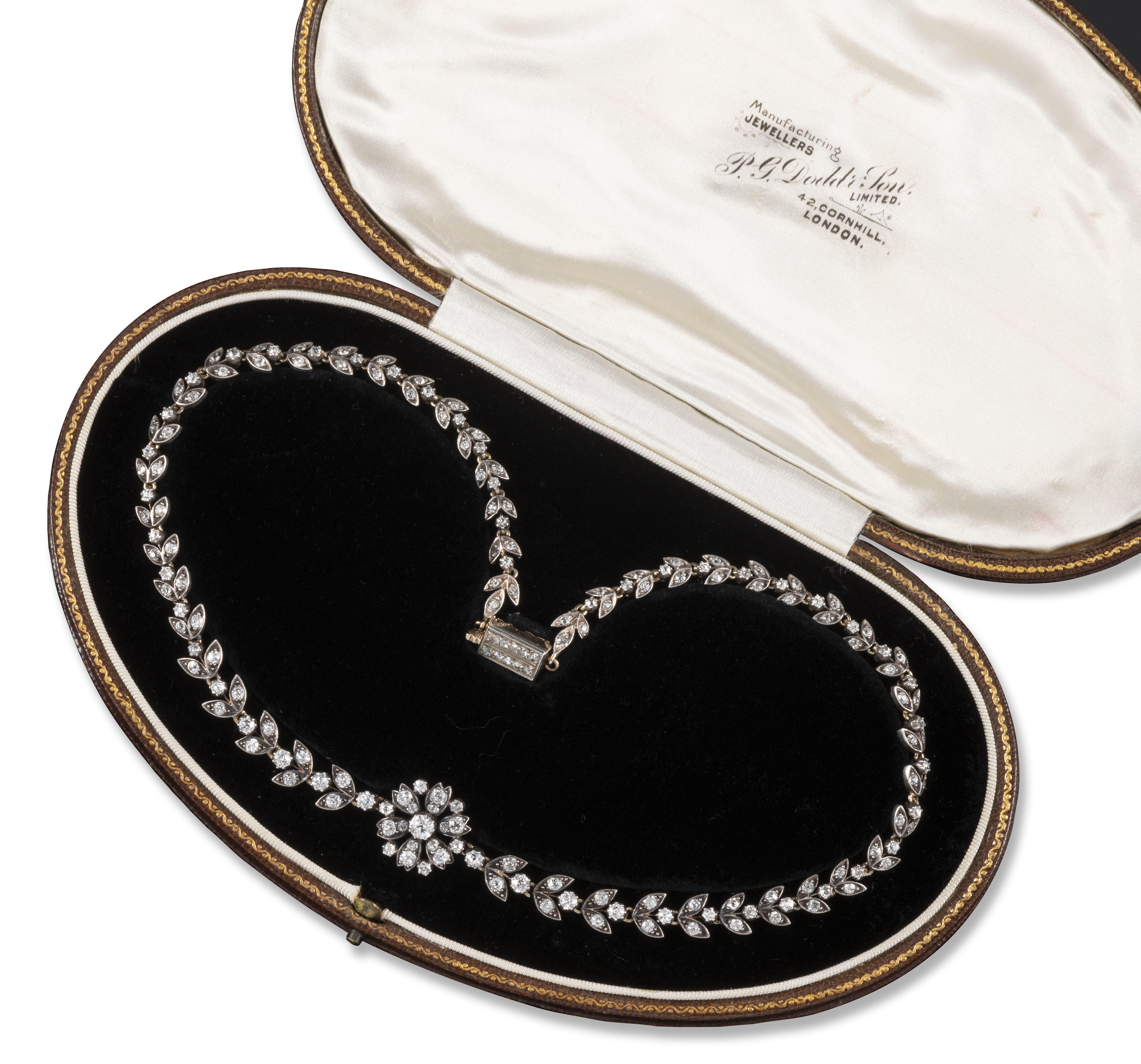 A Victorian diamond laurel necklace, the central flowerhead cluster is set on graduated pairs of diamond-set leaves separated with old cushion-shaped diamonds in silver and gold, 34cm long, fitted case