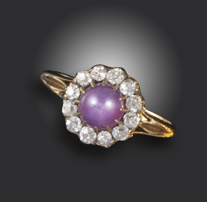 A Victorian star sapphire and diamond cluster ring, the star sapphire cabochon set within a surround of cushion-shaped diamonds in yellow gold, size N, case