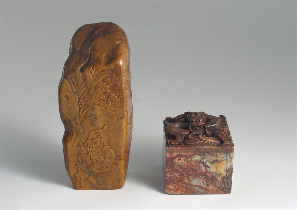 A large Chinese soapstone seal, carved with a seated Lohan and another figure holding a stick from which a dragon emerges, and a square soapstone seal, the top carved with a dragon, the base with a twelve character mark, c.1900, 16.5cm. Max. (2)