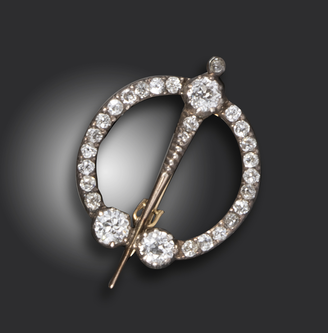 A Victorian diamond-set brooch, the stylised Scottish kilt pin set with graduated old circular-cut diamonds in silver and gold, 2.2cm wide