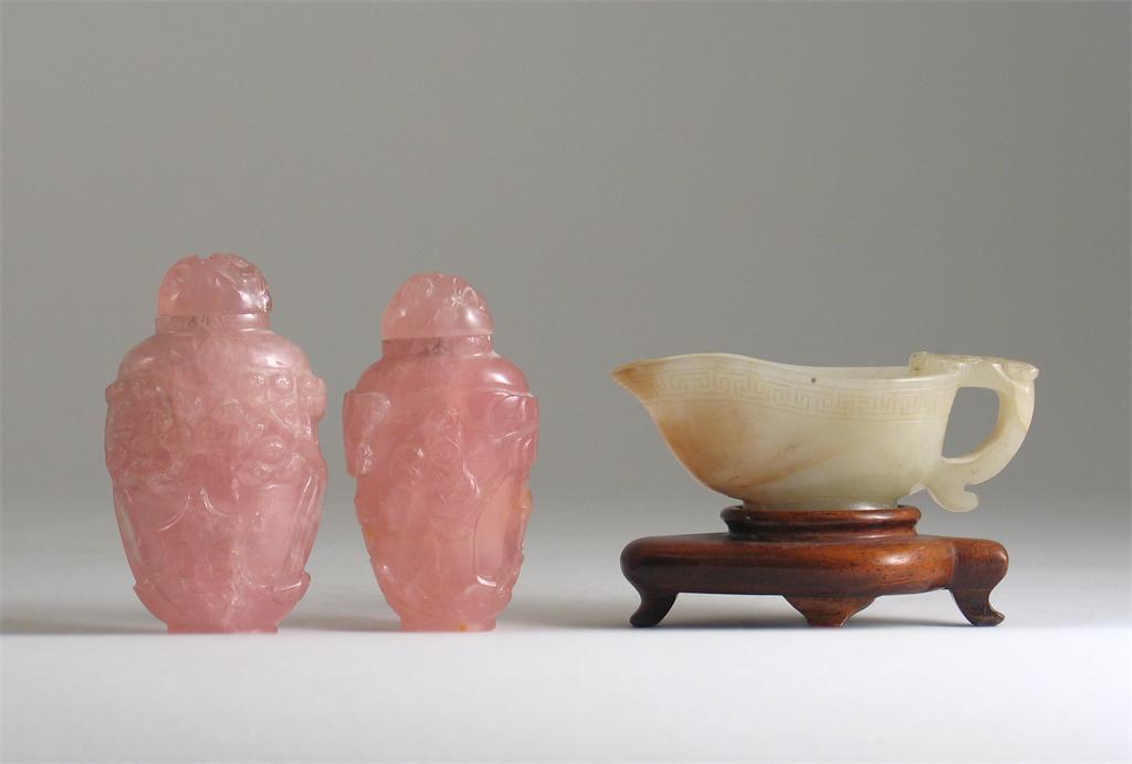 A Chinese jade libation vessel, on a wood stand and two rose quartz snuff bottles and covers, all 19th century, 7.5cm. (6)