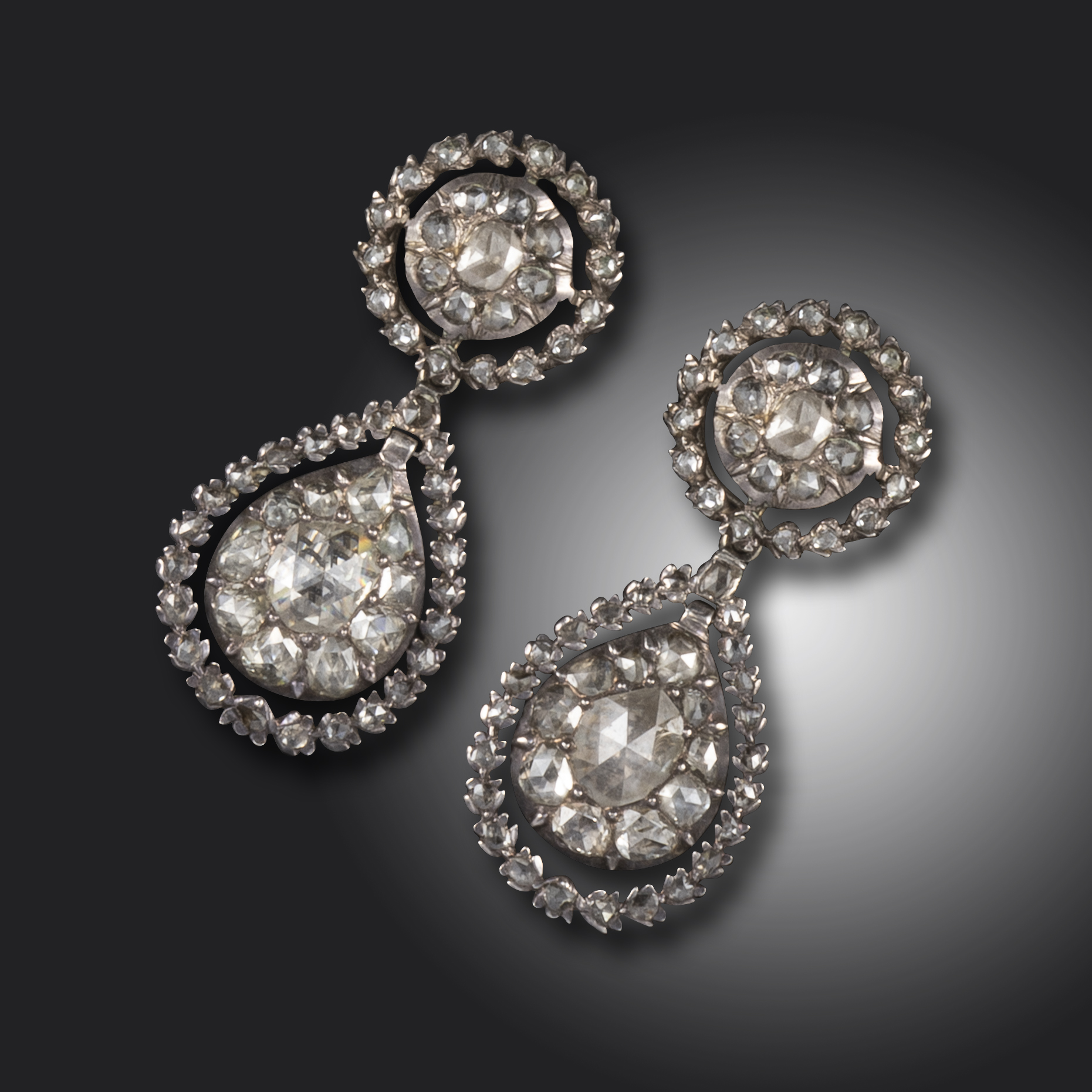 A pair of George III rose-cut diamond pendeloque earrings, the circular studs set with rose-cut diamonds and a concentric outer laurel set with diamonds, suspending detachable rose-cut diamond drops within a diamond-set laurel border in silver, 4.3cm high total (night), the studs 1.6cm high (day)
