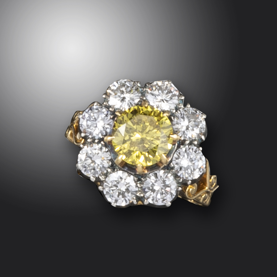 A fancy-coloured diamond cluster ring, the circular-cut fancy-coloured diamond weighs 1.61cts and is set within a surround of round brilliant-cut diamonds in silver on gold, with scroll bifurcated shoulders, size M 1/2