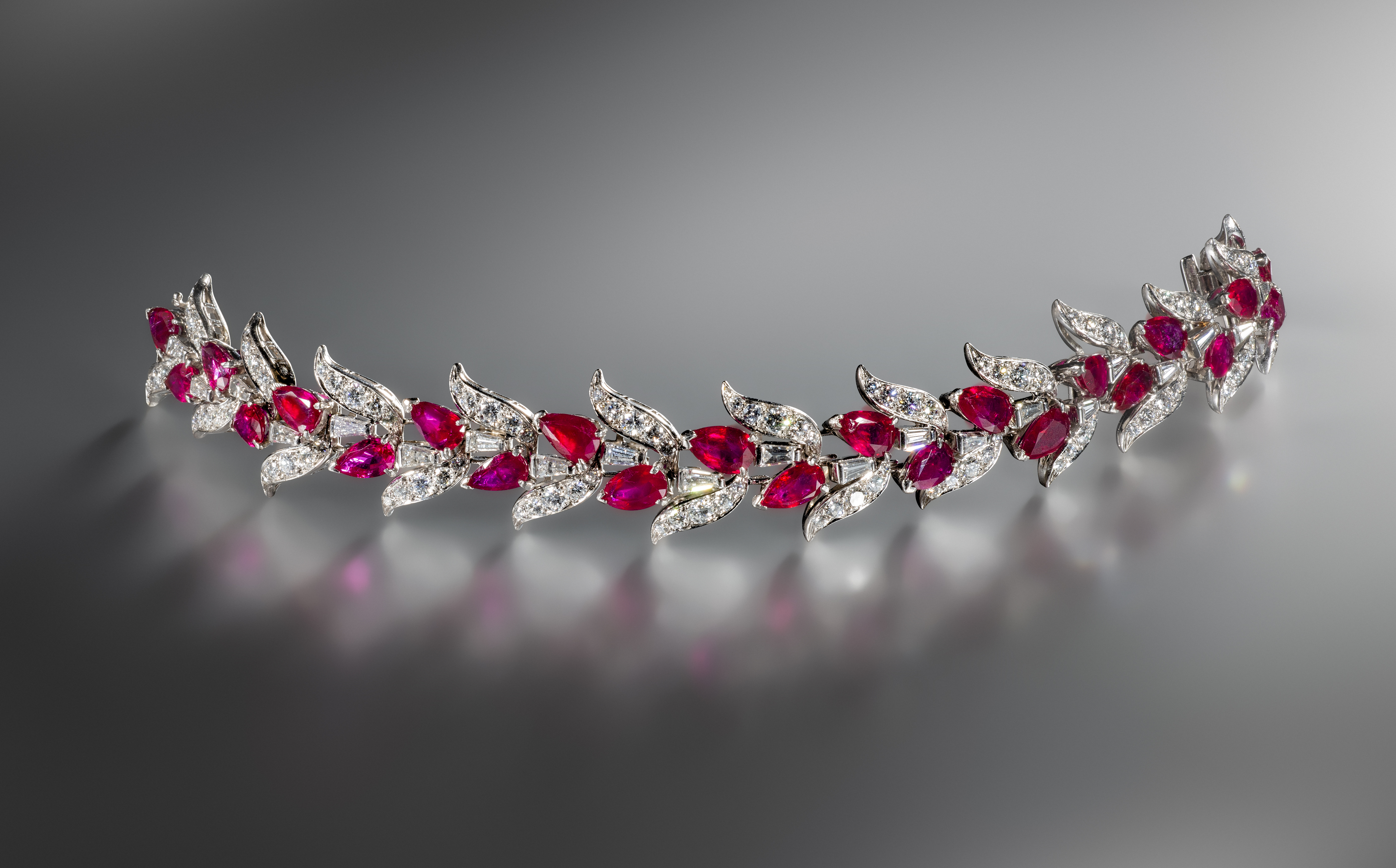 A ruby and diamond bracelet, c1960, designed as a garland of leaves, set with brilliant-cut diamonds and accented by pear-shaped ruby buds, diamonds approximately 7.70 carats total, 18.7cm long