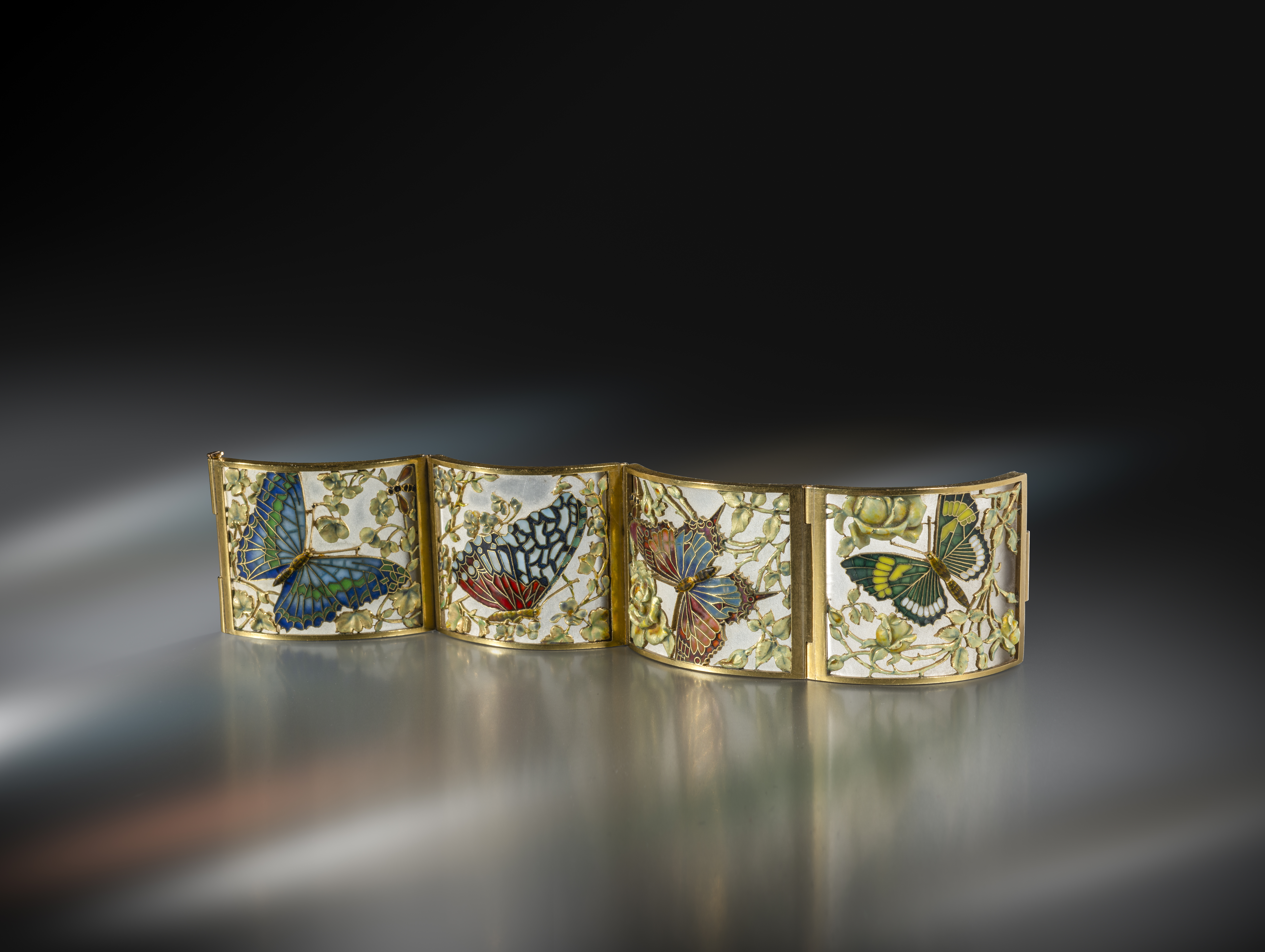 An attractive Art Nouveau enamel butterfly bracelet by Carreras, c1905, designed as a series of four slightly curved open yellow gold panels, each with a different butterfly motif amongst foliage on frosted glass ground, the four butterflies and two further insects each decorated with plique-à-jour and cloisonné polychrome enamel, one butterfly resting with wings folded and the others outstretched, the foliage decorated with shaded light green enamel, signed with applied gold plaque to reverse 'E de A. Carreras Barcelona', each plaque 4.3cm x 4cm, 19cm long, in fitted case marked 'Antigua Joyeria Carreras Paseo Gracia 30 calle Fernando 44 Bakcalona'