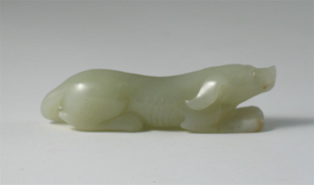 A Chinese pale celadon jade model of a recumbent hound, 19th/20th century, 11cm.