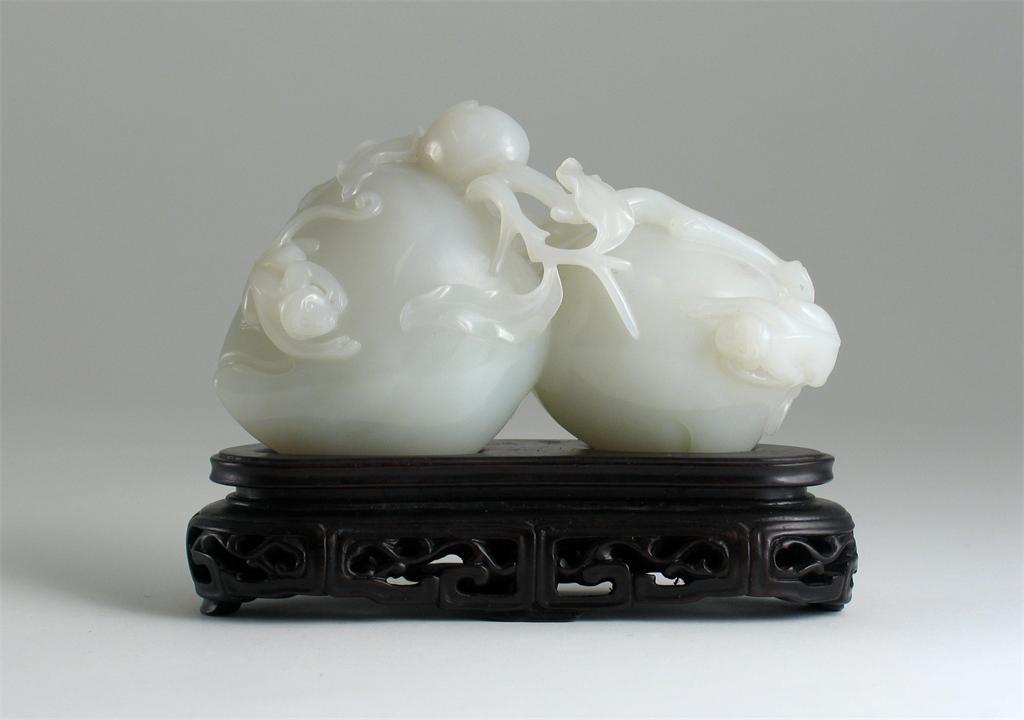A Chinese white jade carving, of two large and three small peaches, upon which two monkeys climb, the surface highly polished, wood stand, 19th or 20th century, 13cm. Across. (2)