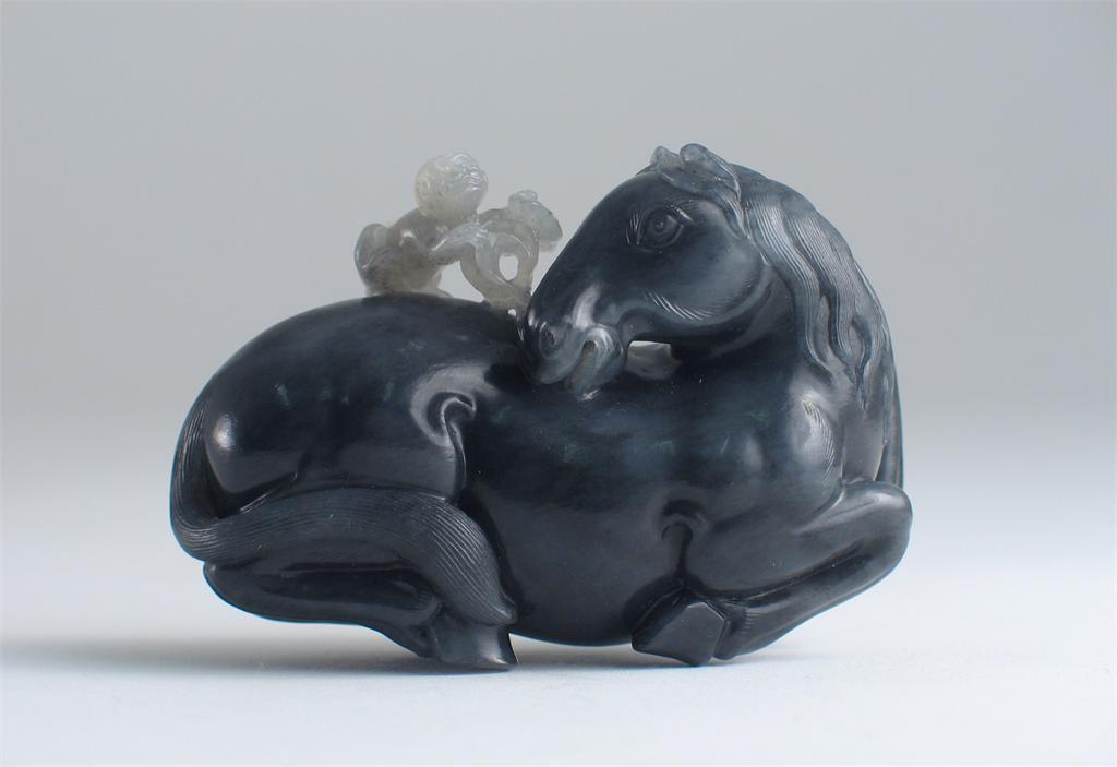 A Chinese jade carving of a recumbent horse, his head turned and with a monkey perched upon his back, the stone grading from black to pale grey, the hair finely detailed, 7cm.