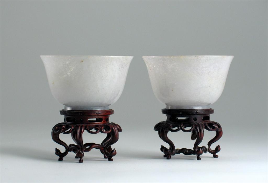 A pair of Chinese jadeite bowls, subtly flared, the stone finely carved, each raised on a high wood stand. One stand damaged. Probably 19th century, 7.5cm. Dia. (4)