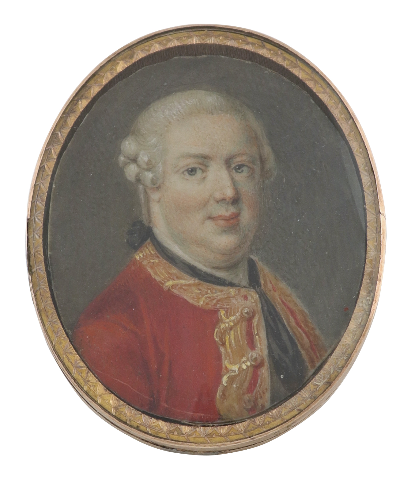 Portrait miniature of a gentleman, in a red coat and black stock with powdered wig