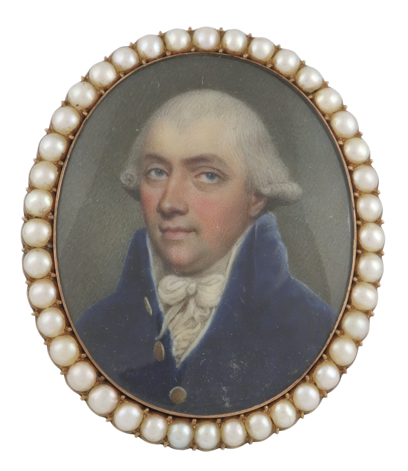 Portrait miniature of a gentleman, wearing a blue coat with gold buttons and white stock