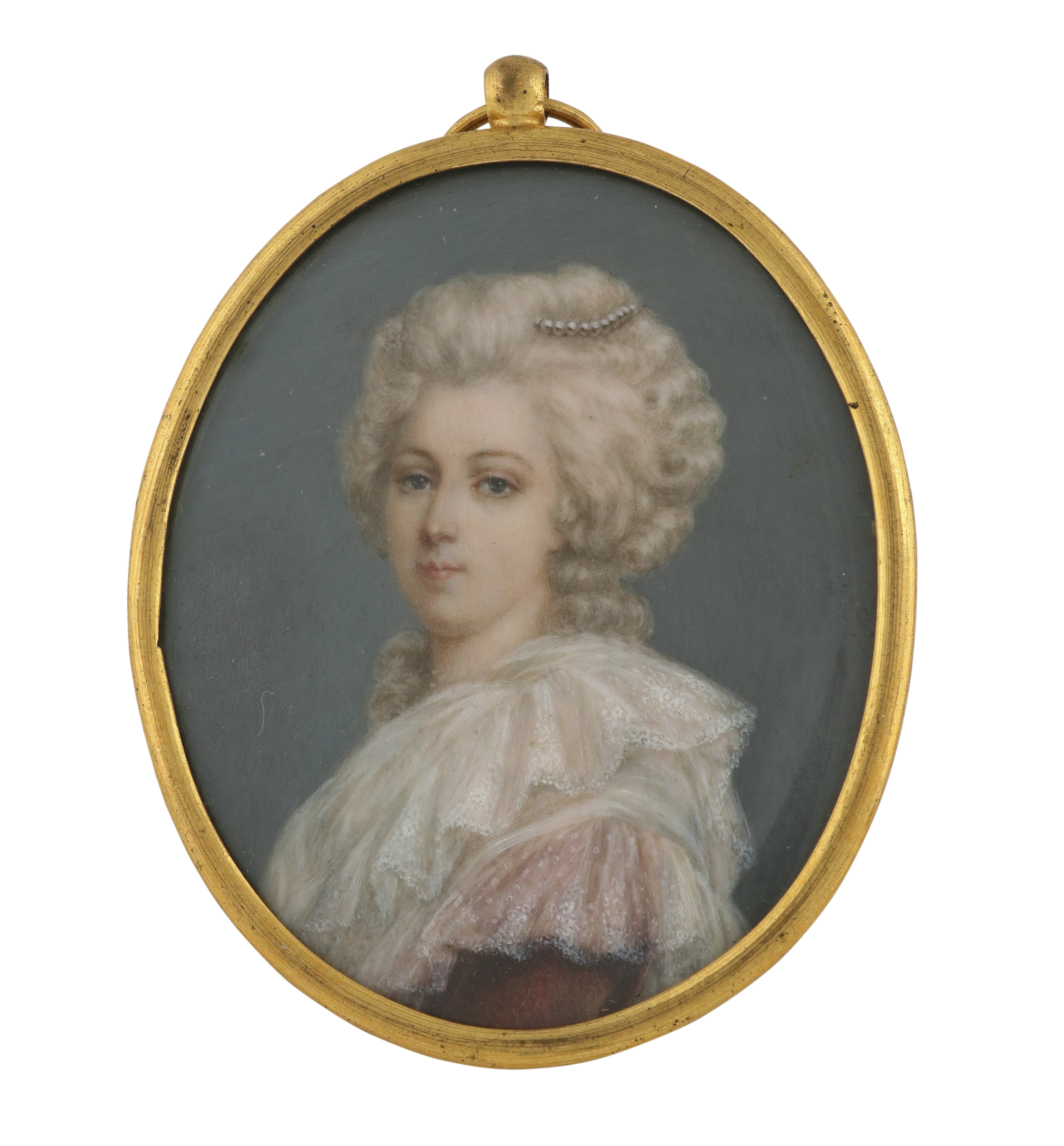 Portrait miniature of a lady, wearing red dress, lace shawl and pearls in powdered hair